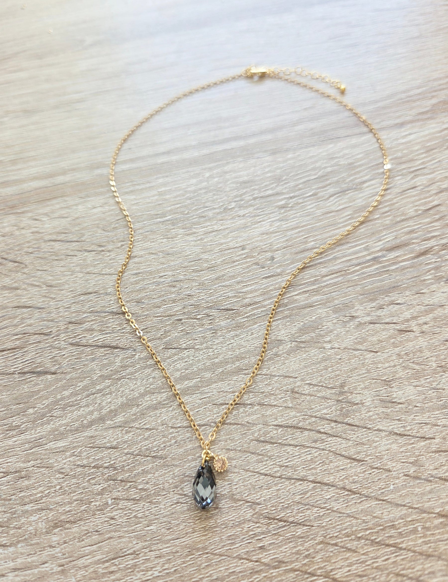 A simple yet elegant short necklace, that is handmade with a sparkling Black Diamond Austrian crystal drop and Golden Shadow charm set on 18K gold plated chain. It will bring shine and instant sophistication to any casual, work or evening outfit.